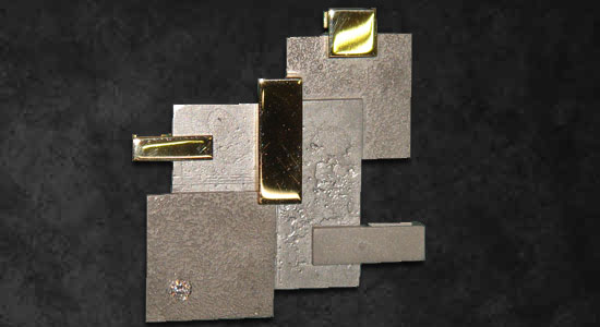 I due inserti rettangolari ed il piccolo quadrato sono in oro 18 carati ed il diamante che contrasta con l’opacità della parte lavorata a