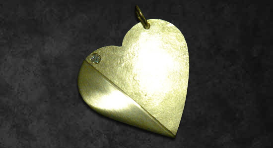 Questo pendente in oro 18 carati con diamante da 0,025 carati è realizzato completamente a mano, partendo da una lastra e battendola fino a dargli