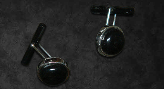 Gemelli di forma circolare in oro bianco 18 carati e semisfera incassata in corno di bufalo nero lucidato, come il barilotto della chiusura basculante.